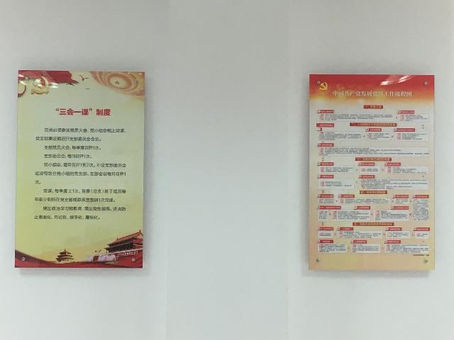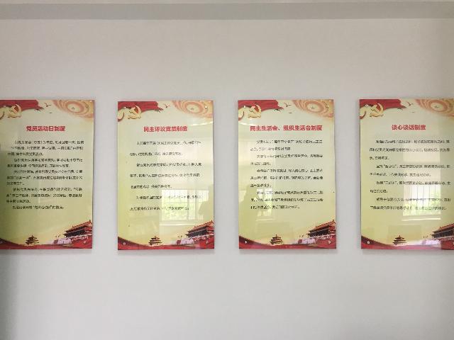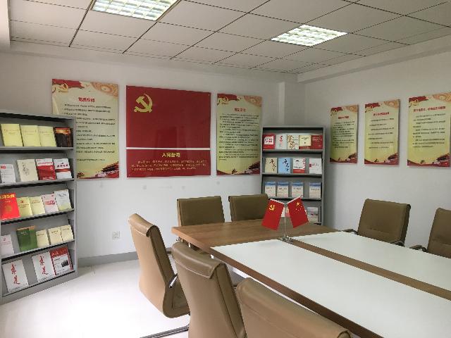 黨員勾當室在奪目地位特設主題教導墻,包含黨旗、入黨誓辭、黨員責任和權力。勾當室內有8個宣揚展版,內容包含構造架構圖、黨委委員崗亭職責、紀委委員崗亭職責、民主糊口會構造糊口會軌制、“三會一課”軌制、民主評斷黨員軌制、成長黨員任務流程圖和黨員勾當日軌制。勾當室還裝備了報刊書架,擺放黨員進修書刊雜志等。